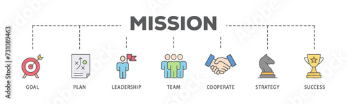 Mission banner web icon illustration concept with icon of goal, plan, leadership, team, cooperate, strategy and success