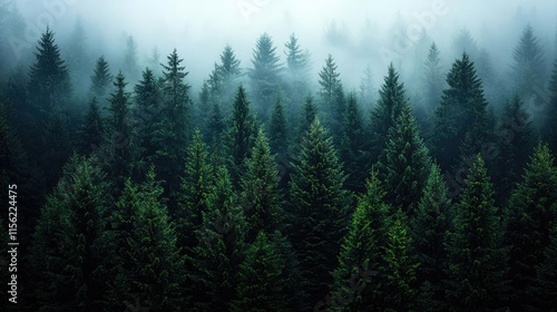 Mist forest concept. Misty evergreen forest with tall trees creating a serene and tranquil atmosphere.