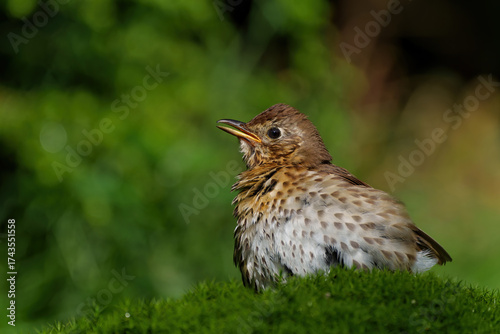 Mistle trush (Turdus viscivorus) hanging around at a pond in the forest in the Netherlands