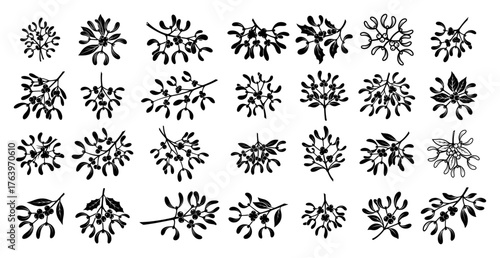Mistletoe icon set Collection of Christmas holiday plant silhouettes with berries for winter decoration Vector illustration