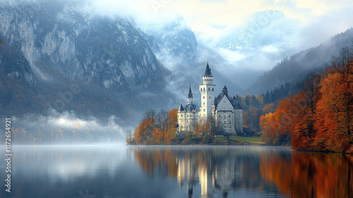 Misty autumn lake reflects fairytale castle nestled in alpine mountains