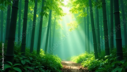 Misty bamboo forest, ethereal light filtering through, organic, soft, asia