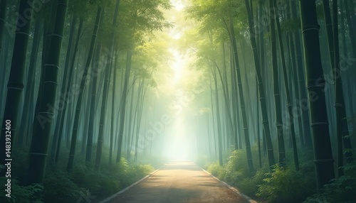 Misty bamboo forest path with sunlight. Serene Asian landscape, suitable meditation. Peaceful atmosphere, green plants and trees, natural beauty. Tranquil travel scenery. Sun rays, zen garden vibes.