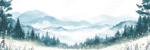 Misty Blue Mountain Landscape, Watercolor Painting with Delicate Floral, Foliage, and Serene Nature