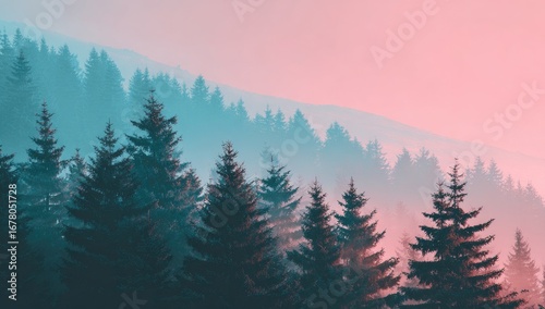 Misty coniferous forest with pink sky, layers of trees receding into the distance, creating depth and a sense of calm