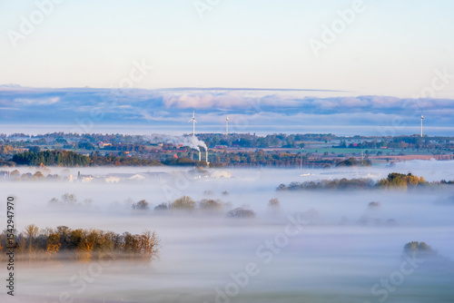 Misty countryside view with smoke from chimney