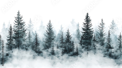 Misty evergreen forest silhouette against a white background evoking a sense of mystery and serene nature.
