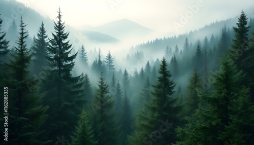 Misty Evergreen Forest with Pine Trees and Rolling Hills in Fog