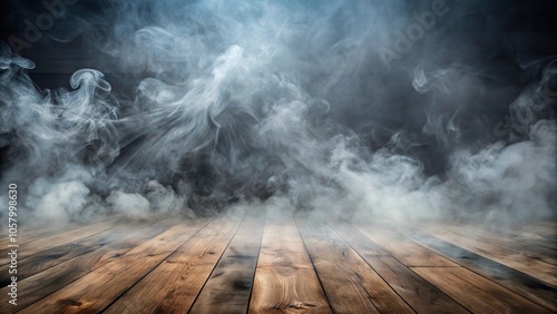 Misty fog gray smoke swirling over dynamic wood floor background, high angle view