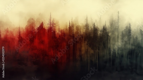 Misty forest fire, mountain range background, nature landscape, environmental art