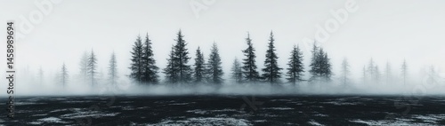 Misty forest in monochrome. Silhouettes of tall evergreens stand in a dense fog. A vast expanse of muted grays and blacks
