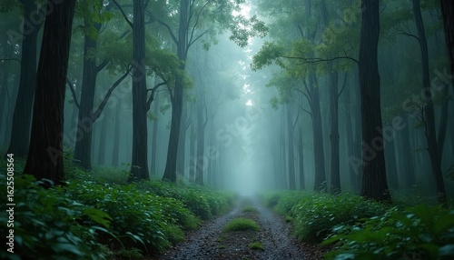 Misty forest path during rainfall. Tall trees line the dirt road surrounded by rich green undergrowth. Overcast sky creates a moody, serene atmosphere. Gentle rain falls on leaves and ground.
