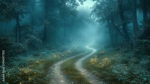Misty forest path, winding, ethereal glow.