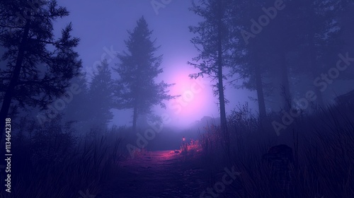 Misty forest path with firelight at dusk.