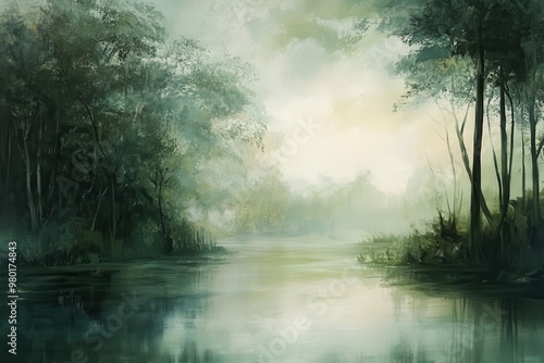 Misty Forest River Landscape with Trees Reflecting in Water