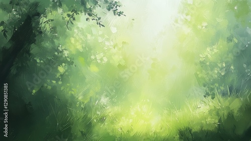 Misty forest scene with sunlight filtering through trees, vibrant green foliage, serene nature background, tranquil outdoor atmosphere, peaceful woodland setting.