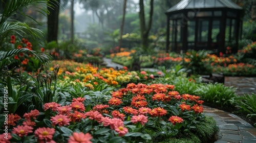 Misty garden path with colorful flowers and gazebo.
