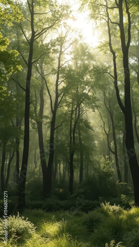 Misty green forest, sunlight filtering through dense canopy, atmosphere, shadows, nature