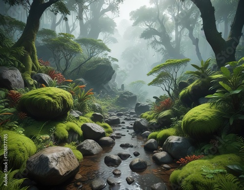 misty jungle atmosphere with moss-covered rocks and dense foliage, trail, wildflowers