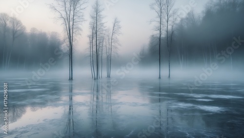 Misty landscape featuring bare trees emerging from a frozen lake, with reflections and fog creating an ethereal atmosphere.