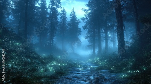 Misty, moonlit forest path. Glowing flora