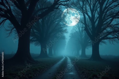 Misty moonlit path, ancient trees loom, eerie shadows , trail, mist, spooky