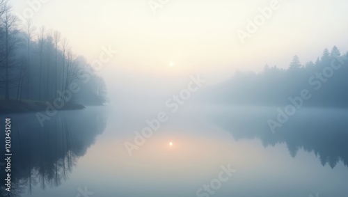 Misty morning by a lake with a mirror-like surface