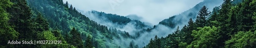 Misty morning in a lush forest landscape with fog rolling over mountains