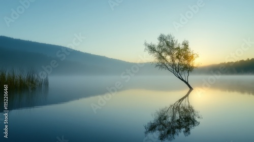 Misty Morning Lake Serenity - Tranquil sunrise scene, solitary tree reflected in calm water, misty morning atmosphere, peaceful nature, serene landscape.