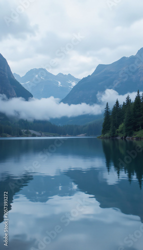 Misty Morning Lake with Mountain Reflections and Forested Landscape