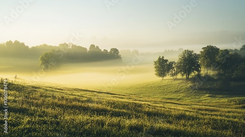 Misty Morning Landscape with Gentle Hills and Trees
