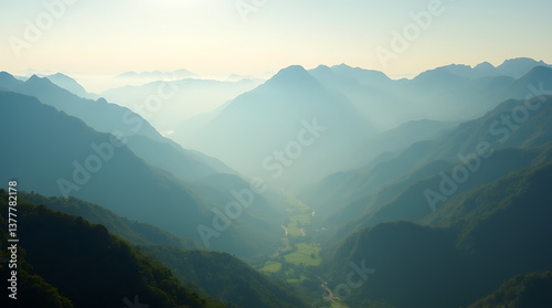 Misty Morning Mountain Range with Soft Sunlight and Green Valleys for Nature Lovers