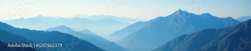 Misty morning on mountain peaks under blue sky, mist, foggy