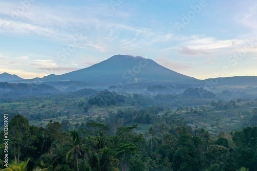Misty Morning Over Rice Fields and Mount Agung Volcano