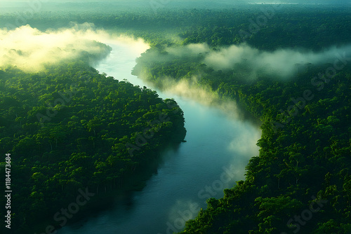 Misty Morning River Winding Through Lush Green Rainforest Canopy