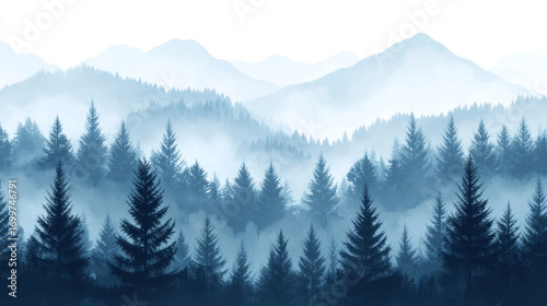 Misty mountain forest serene landscape blue hues tranquil nature scenery