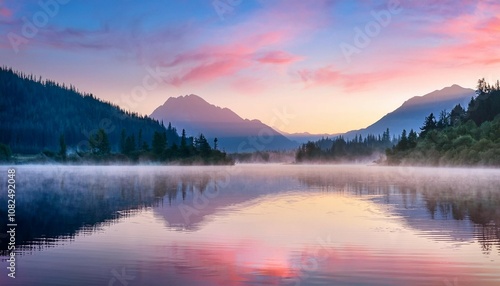 misty mountain lake greets serene sunrise with soft pastel watercolor hues