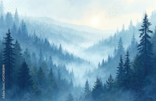Misty mountain landscape shows dense forest. Foggy morning. Pine trees. Nature scene. Winter cold season. Peaceful atmosphere. Blue, white tones. Outdoor view. Suggests serene getaway vacation