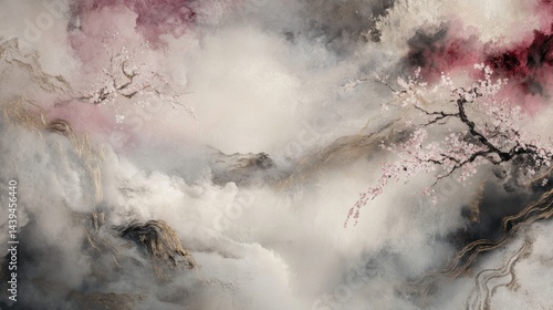 Misty mountain landscape with cherry blossoms, painted in muted tones.