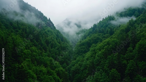 Misty mountain landscape with lush greenery and fog creating a mystical atmosphere in nature : Generative AI