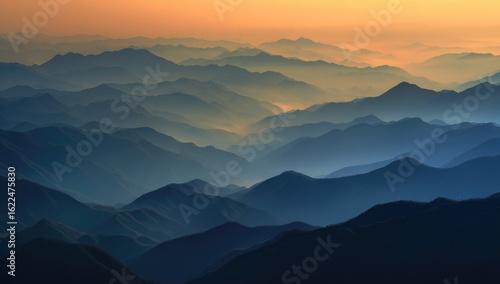 Misty mountain range at sunrise. Soft, layered peaks in shades of blue and dark-grey, hazy atmosphere
