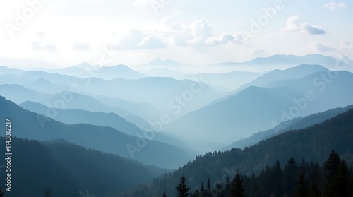 Misty Mountain Range in Soft Blue Hues, Generative AI