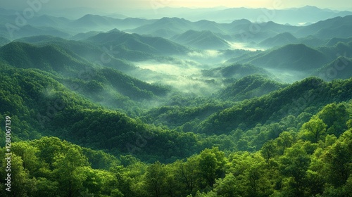 Misty Mountain Range, Lush Forest, Sunrise