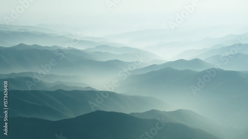 Misty mountain ranges layered in soft blues and grays create a tranquil and ethereal landscape view.