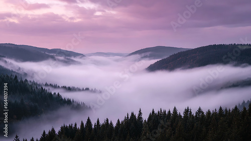 Misty mountain valley at sunrise with purple sky and evergreen trees image