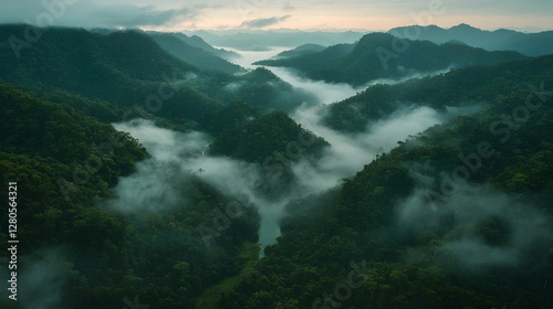 Misty mountain valley sunrise, aerial view