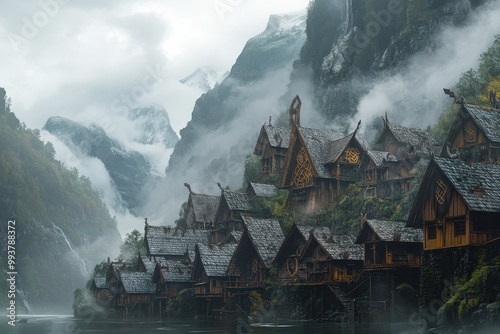 Misty Mountain Village with Wooden Houses and Waterfalls