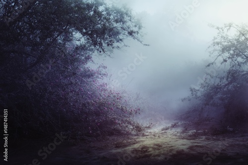 Misty Path: Purple Blossoms in a Dreamlike Forest