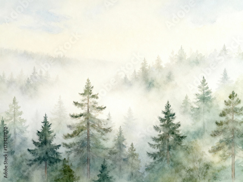 Misty Pine Forest Watercolor Landscape Art