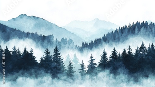 Misty pine forest with layers of distant mountains fading into the fog, creating a serene and tranquil natural landscape.